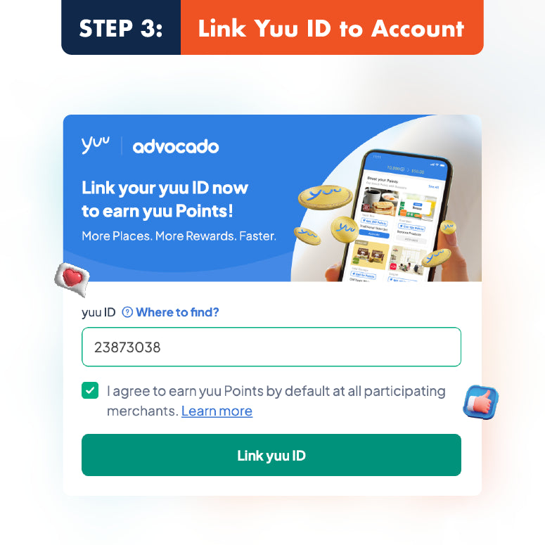 To earn yuu Points from eligible transactions at participating merchants, you need to be a loyalty member of the merchant and a registered yuu Member with a valid yuu ID. You will also need to link your yuu Account to your Advocado account.